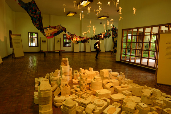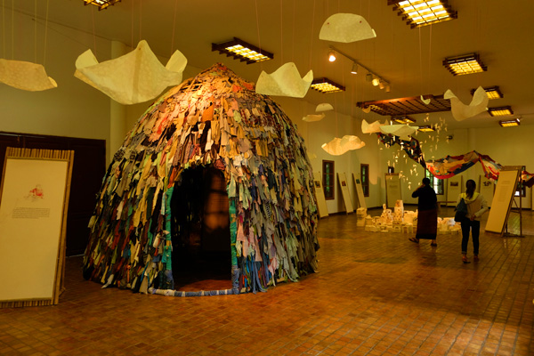 ผ่านศิลปะการจัดวางวัสดุเหลือใช้ของโรงงานหัตถกรรม ในโครงการพัฒนาดอยตุง (พื้นที่ทรงงาน) อันเนื่องมาจากพระราชดำริ ที่สมเด็จย่าทรงริเริ่มขึ้น