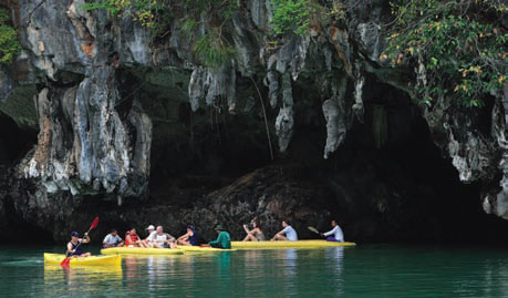 เดินทางผ่านผืนน้ำและฝ่าสายลมเข้าไปสัมผัสทะเลกระบี่อย่างใกล้ชิด ด้วยการพายคายักเลาะเลียบเกาะห้อง นอกจากสนุกกับการจ้วงใบพายแหวกผิวน้ำพาเรือพุ่งไปข้างหน้าด้วยสองแรงแขนแล้ว ยังได้ชื่นชมความงามของกลุ่มเกาะหินปูนรูปลักษณ์แปลกตา หน้าผาสูงชันตระหง่านเงื้อม พรรณไม้เขียวกระจ่างตา และหินงอกหินย้อยที่ประดับประดาราวกับเป็นงานประติมากรรมแห่งเทือกเขาหินปูน ไฮไลต์ของเกาะห้องคือทะเลใน หรือลากูน ที่ถูกโอบล้อมด้วยหน้าผาสูง ซึ่งแซมสลับด้วยพรรณไม้ป่าเขาหินปูน หลังจากผ่านพ้นปากทางทะเลในเข้าไปแล้ว คุณจะพายเรือเล่นเพลินๆ หรือผ่อนแรงพาย แล้วกระโดดตูมลงเล่นน้ำตื้นใสแจ๋ว ก็ล้วนแต่เป็นทางเลือกที่นำมาซึ่งความสุขกายสบายใจ