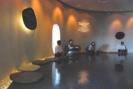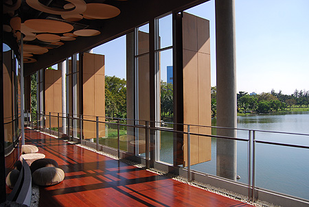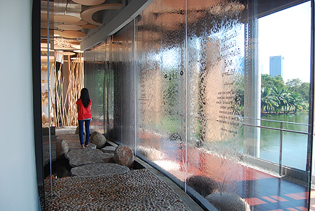 ด้านในจัดห้องเป็นโซนต่างๆ ได้อย่างลงตัวและเพลิดเพลิน มีก้อนหินนุ่มๆ ให้เรานั่งสมาธิ มีกำแพงแก้ว และม่านน้ำประกอบ เพื่อให้ได้ลองลิ้มชิมนิพพานได้นานเท่านานตามความพอใจ พอเดินมาทางด้านหลังห้องก็จะพบกับวิวอันสวยสดงดงามของสวนรถไฟให้ได้ลิ้มลองกันต่อ เป็นห้องที่เปิดหน้าต่างโล่งโปร่งทุกทิศทุกทางแบบ Open-Air ให้ได้สูดอากาศบริสุทธิ์กันแบบเต็มๆ ปอด จะนั่งเล่นอ่านหนังสือ หรือเดินจงกลม เจริญสติได้ตามอัธยาศัย