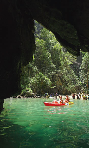 ใครกันจะไม่ตื่นเต้นกับการลอยคอพ้นระดับ น้ำทะเล แล้วลดเลี้ยวเข้าไปในอุโมงค์มืดมิด ของเกาะมุกด์ เพื่อเข้าสู่จุดหมายปลายทาง ที่นับว่าเป็นแหล่งสุดยอดความงดงามอีก แห่งหนึ่งในทะเลไทย ที่นั่นคือ ‘ถ้ำมรกต’ ที่สร้างความตื่นตาตื่นใจ ให้กับทุกคนที่เดินทางไปเยือน โดยเฉพาะถ้า ไปในช่วงเวลาที่ลำแสงแห่งตะวันสาดส่อง เป็นลำลงมากระทบผิวน้ำพอดี จะเห็นประกาย ระยิบระยับราวกับมีเพชรเม็ดงามนับร้อย ดารดาษอยู่บนผิวน้ำสีเขียวมรกตใสแจ๋ว ที่สามารถลงแหวกว่ายได้อย่างเย็นชื่น ไม่เพียงเท่านั้น ภายในโอบล้อมของผาหินปูน ยังมีพรรณไม้สีเขียวชอุ่มขึ้นแซมประดับ รวมเป็นองค์ประกอบภาพที่ทำให้ถ้ำมรกต งดงามจับตาจับใจ