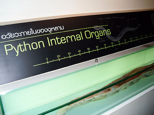 14.30 น. สาธิตการจับงูหลากหลายชนิด พร้อมถ่ายรูปกับงูหลาม บนอัฒจันทร์กลางแจ้ง สวนงู