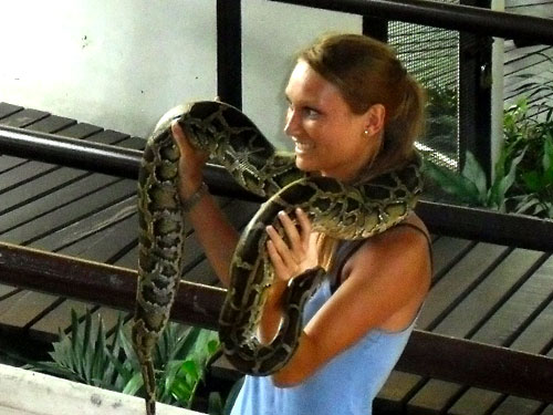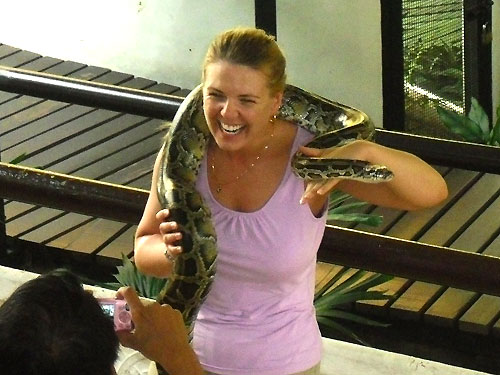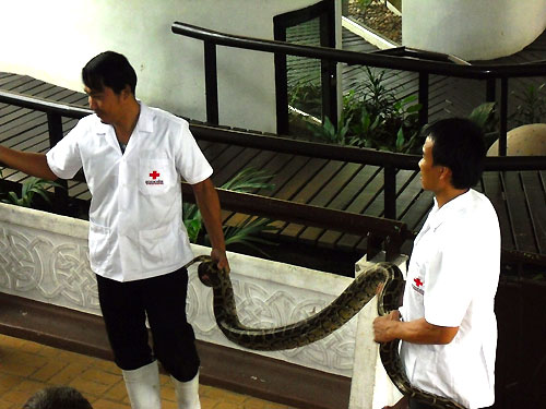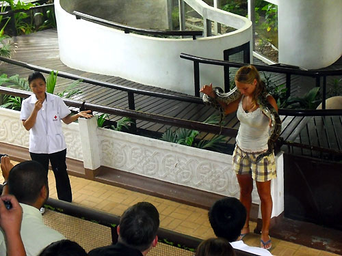 11.00 น. สาธิตการจับงูหลากหลายชนิด พร้อมถ่ายรูปกับงูหลาม บนอัฒจันทร์กลางแจ้ง สวนงู