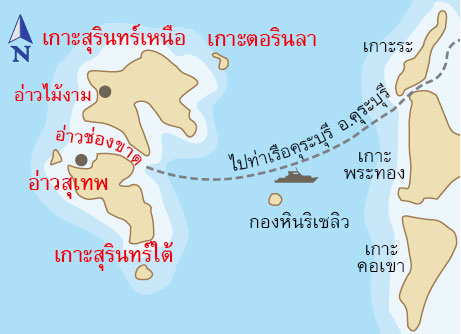 หมู่เกาะสุรินทร์ ประกอบด้วยเกาะใหญ่ 2 เกาะคือ เกาะสุรินทร์เหนือและสุรินทร์ใต้ ตั้งอยู่กลางทะเลอันดามันห่างจากท่าเรือคุระบุรี จังหวัดพังงา ราวชั่วโมงครึ่ง โดยการเดินทางด้วยเรือเร็ว นอกจากน้ำทะเลใส หาดทรายขาว ป่าไม้อุดมสมบูรณ์ ที่นี่ยังเป็นถิ่นที่อยู่ของชาวเลเผ่ามอเก็น เป็นบ้านแสนสวยของปลาการ์ตูนที่พบมากบริเวณอ่าวช่องเขาขาด นอกจากนี้ที่เกาะบอน หมู่เกาะสิมิลันซึ่งอยู่ใกล้เคียง ยังเป็นแหล่งดูกระเบนราหูที่ดีที่สุด
